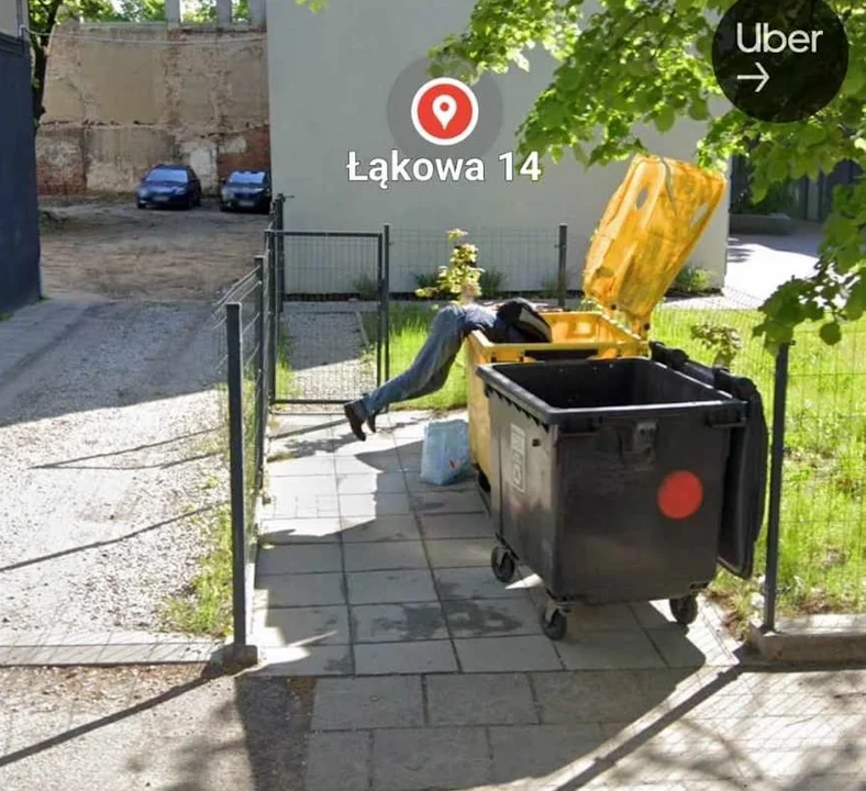 Profil LDZ Zmotoryzowani Łodzianie zamieścił zrzut ekranu, z aplikacji Google Street View, na którym znajduje się łodzianin, który próbuje wejść do śmietnika. Kamery pojazdów Google uchwyciły mężczyznę w okolicy ulicy Łąkowej.