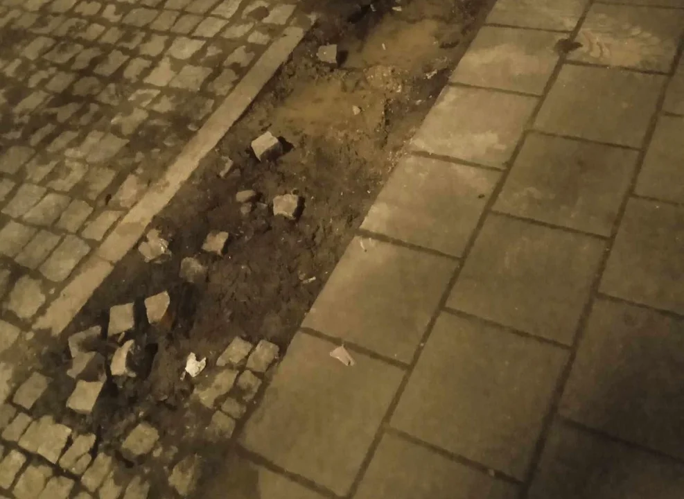 „Jaracza nr 19/21 taka piękna kostka już nie powiem o ulicy, co się dzieje” napisał jeden z internautów, publikując przy tym zdjęcie zniszczonego bruku.