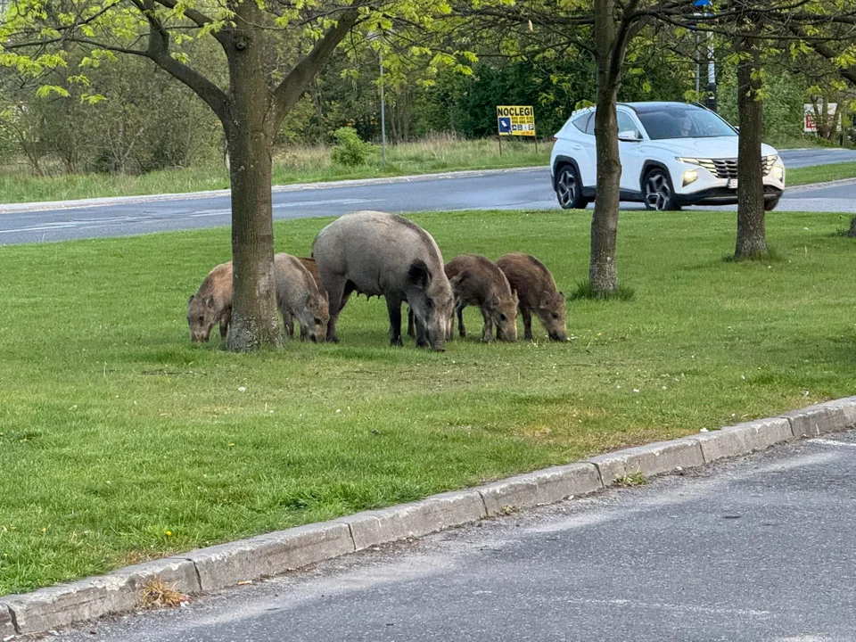 Zwierzaki bez żadnego skrępowania spacerowały w weekend po parkingu przylegającym do centrum handlowego Tulipan przy alei Piłsudskiego. Locha wraz z pięcioma warchlakami przechadzała się po trawnikach, poszukując prawdopodobnie pod drzewami owoców. Robiła to ku uciesze przechodniów i kierowców, na widok dzikich zwierząt wyciągali telefony komórkowe i robili zdjęcia.
