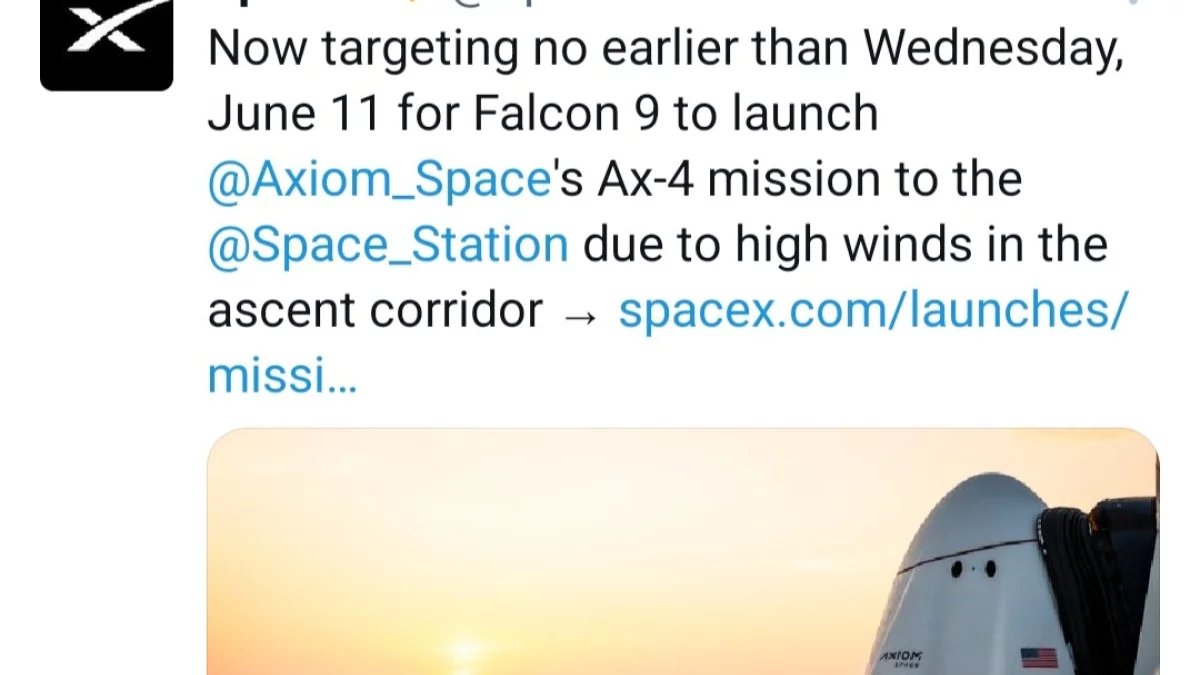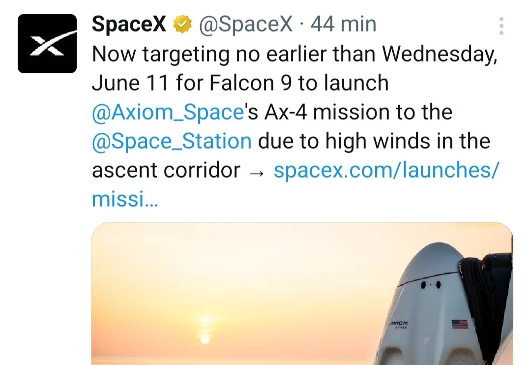 "Obecnie planujemy, że Falcon 9 nie wystartuje wcześniej niż w środę 11 czerwca z misją Ax-4 ze względu na silne wiatry w korytarzu wznoszenia"