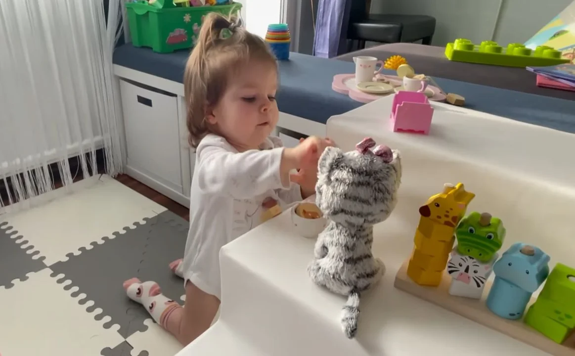 "Jeszcze nie minął miesiąc odkąd Majcia nauczyła się czworaczkować a już jej mało! Spostrzegliśmy, że Maja raczkując, często próbuje się na coś wspinać. Na próbę zaopatrzyliśmy się w miękkie schody rehabilitacyjne i to był strzał w dziesiątkę. Od teraz Majcia codziennie częstuje wszystkie pluszaki herbatką, poruszając się przy tym na kolankach, potrafi godzinami ćwiczyć sama, bardzo dobrze się przy tym bawiąc" - informują państwo Kwiatkowscy.
