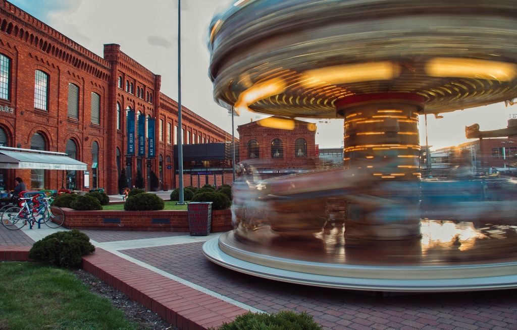 Trudno wyobrazić sobie letni krajobraz Manufaktury bez stylowej karuzeli wiedeńskiej – co roku, gdy robi się ciepło, pojawia się na rynku, w sąsiedztwie restauracji Szpulka i sklepu TK Maxx.