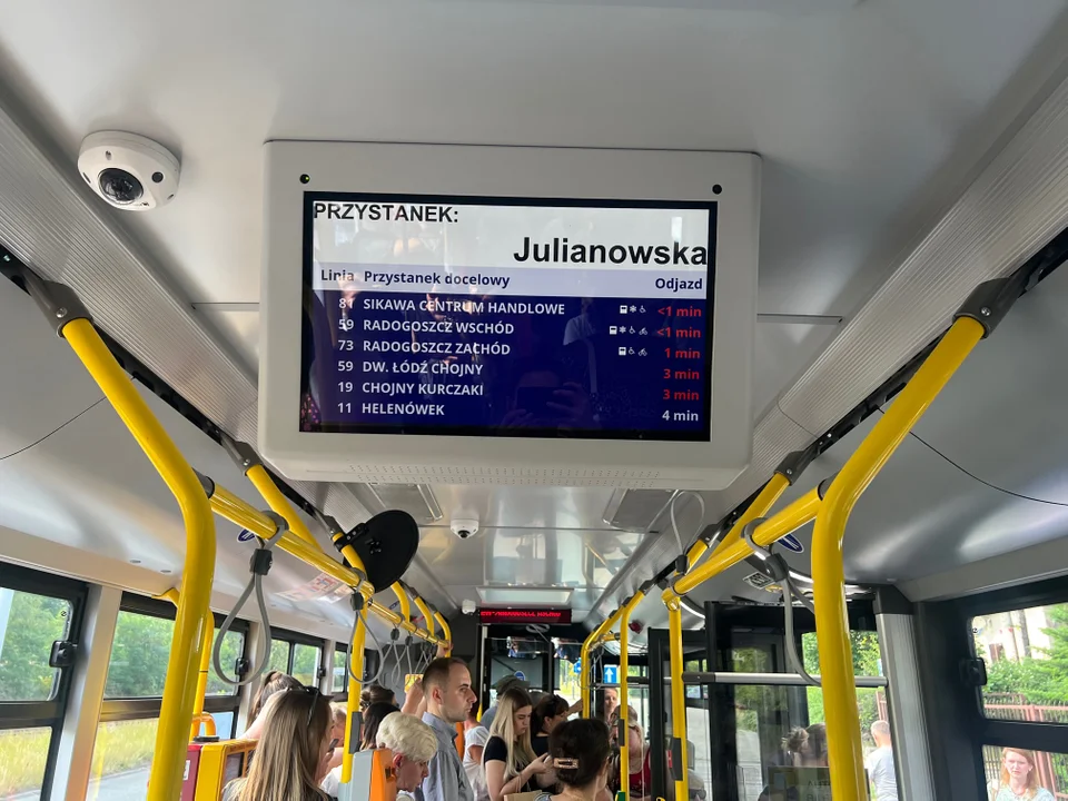 Na monitorach umieszczonych pod sufitem autobusu znajdziemy informacje o przesiadkach. Gdy pojazd będzie zbliżał się do przystanku, na ekranie zobaczymy informacje o innych liniach dostępnych w tym miejscu, nie tylko na danym przystanku, ale całym węźle przesiadkowym, oraz czasie przyjazdu poszczególnych pojazdów