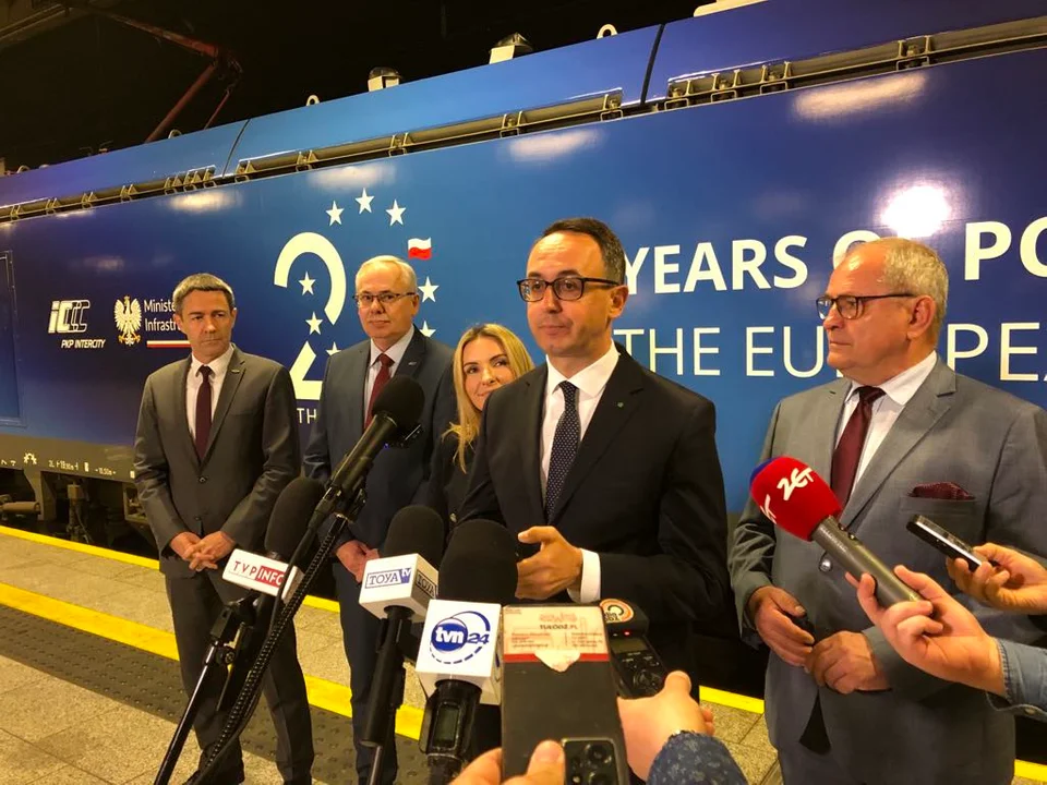 - Jesteśmy na dworcu Łódź Fabryczna. Jest to jeden z symboli skoku, jaki dokonał się w rozwoju polskiej infrastruktury transportowej na przełomie 20 lat, czyli odkąd jesteśmy w Unii Europejskiej. Za mną jest pociąg ze specjalną grafiką jubileuszową z okazji 20-lecia Polski w Unii Europejskiej, bardzo wiele dobrego zadziało się przez te ostatnie wszystkie lata zarówno w sektorze transportu kolejowego, drogowego, lotniczego, jak i w sprawie transportu morskiego.