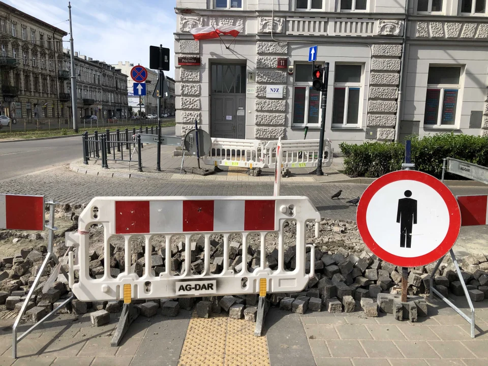 Drogowcy pojawili się na wysokości przejścia dla pieszych, które na czas prac musiało zostać zamknięte. Najbliższe przejście dla pieszych w ciągu Zachodniej znajduje się po drugiej stronie skrzyżowania lub jeśli kierujemy się w stronę pl. Wolności to przy ul. Piotrkowskiej.