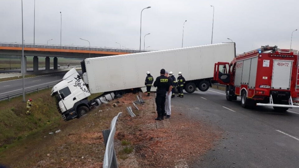 Około godz. 13.00 na zjeździe z S8 przy autostradzie A1 niedaleko Rzgowa (324km) w kierunku Łodzi TIR wypadł z jezdni.