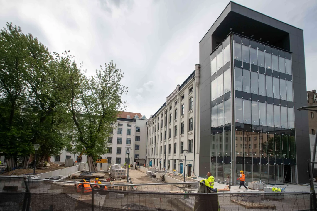 Przed fabrykami trwają prace nad budową skweru z bezpiecznym placem zabaw, małym amfiteatrem i tarasem restauracji. Na podwórku nie zabraknie zieleni. Posadzone zostaną graby i klony oraz kwiaty, krzewy i trawy ozdobne. Pojawią się też nowe ławki i siedziska, stojaki na rowery oraz latarnie.