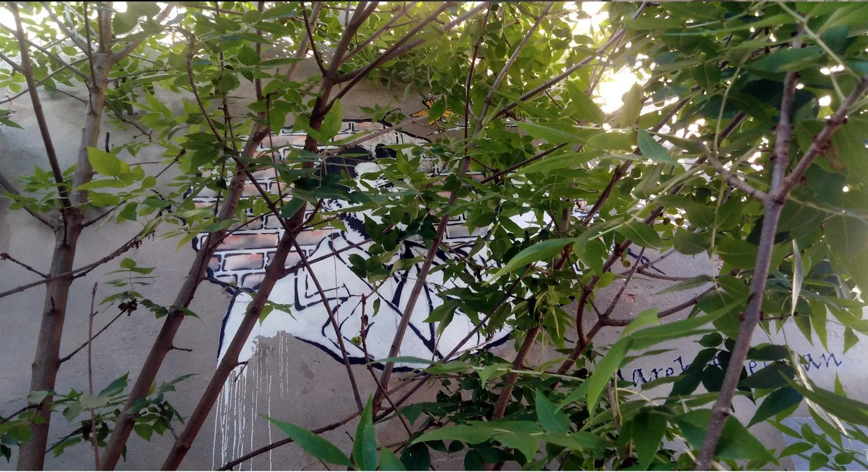W dodatku mural jest coraz mniej widoczny, ponieważ zasłaniają go rośliny, które gęsto rozrosły się na sąsiadującym z kamienicą skwerze.