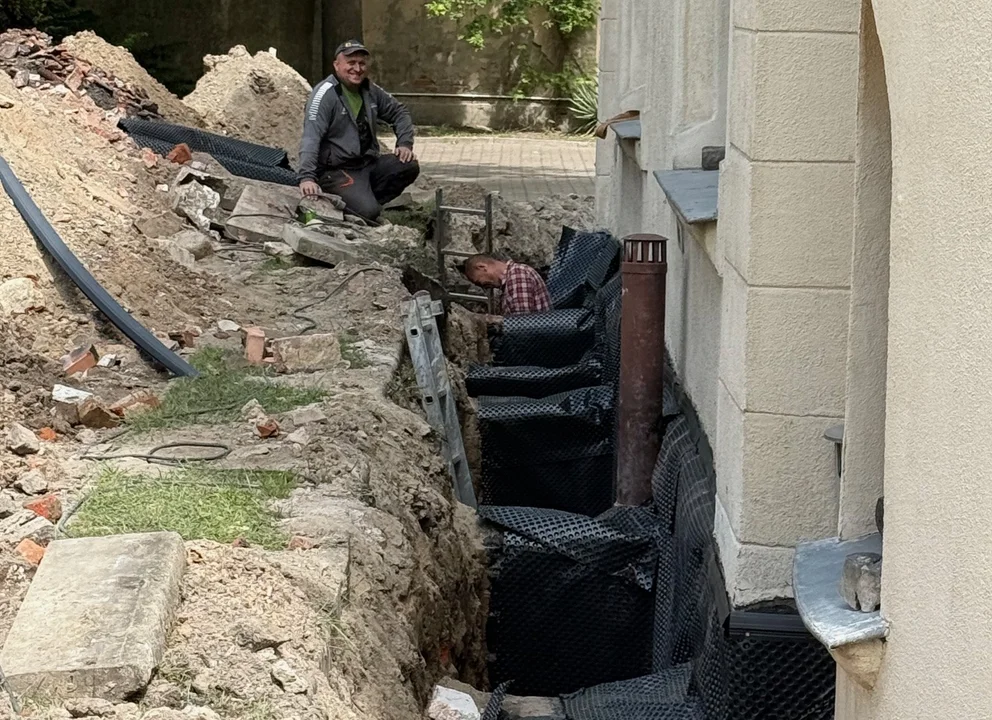 Wcześniej zdemontowano kostkę brukową wokół budynku. Po zakończeniu prac, zasypaniu wykopów i wyrównaniu terenu, nawierzchnię pokryły białe kamienie. Tak zalecenił konserwator, który podkreśla, że taki materiał sprzyja lepszej wentylacji murów.
