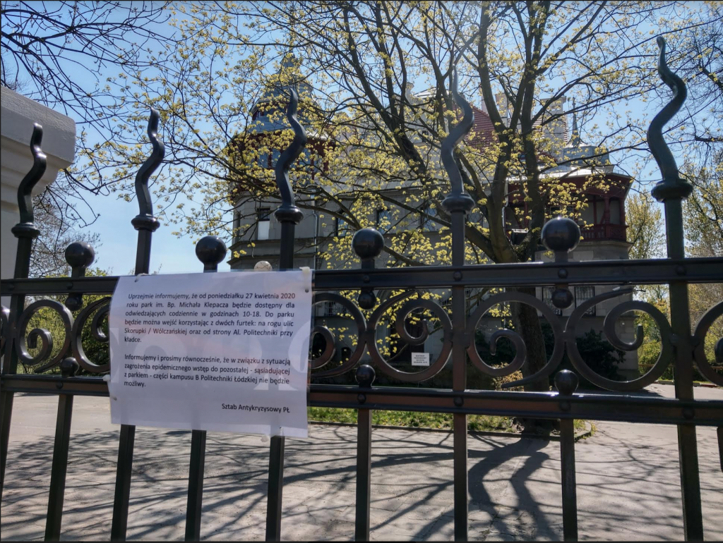 Park Klepacza zostanie udostępniony dla odwiedzających codziennie w godzinach 10-18, począwszy od poniedziałku 27 kwietnia 2020 roku. Do Parku będzie można wejść poprzez dwie furtki: z rogu ulic Skorupki / Wólczańskiej oraz od strony Al. Politechniki przy kładce.