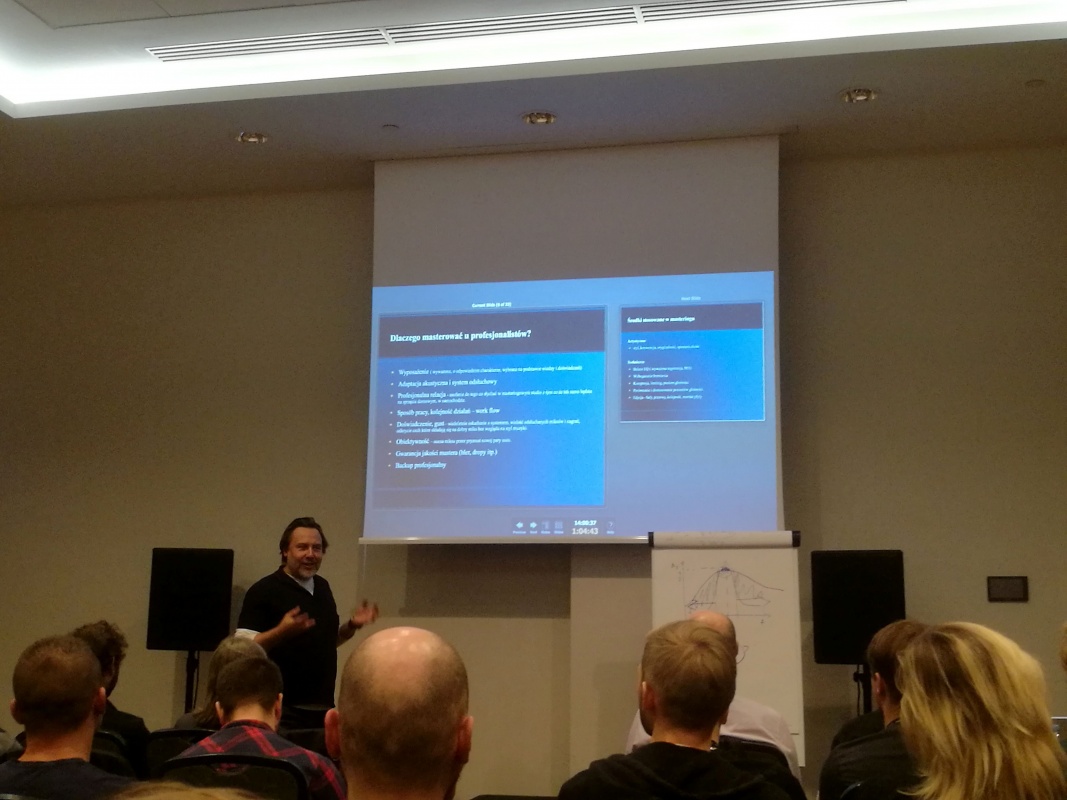 Trzy godziny później rozpoczęły się zajęcia warsztatowe z masteringu, które poprowadził mistrz w tym fachu, jeden z najlepszych, jeśli nie najlepszy fachowiec w Polsce - Grzegorz Piwkowski. Uczestnicy mieli wielką przyjemność spędzić 180 minut zgłębiając wiedzę związaną z produkcją muzyczną w jej końcowym etapie. Wykładowca po zakończeniu zajęć długo jeszcze odpowiadał na liczne pytania w kuluarach, ponieważ w tej samej sali swój znakomity wykład – „Miks w DAW” poprowadził legendarny realizator Piotr Madziar, który ma swoich wiernych fanów przybywających z całej Polski.