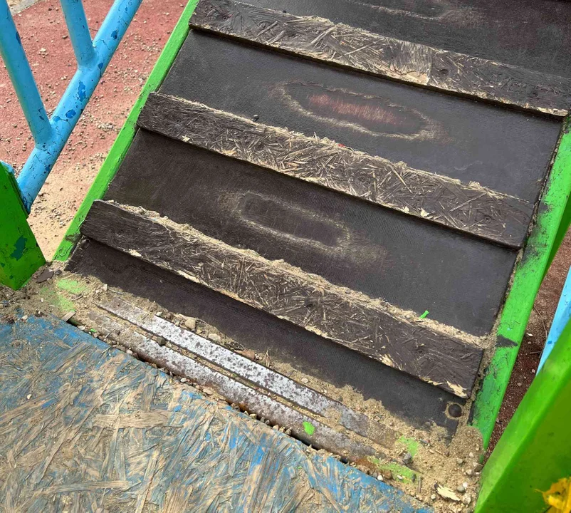 Przede wszystkim chodzi o drabinki prowadzące do podestów i o same podesty. Widać ich mocne zużycie, co może stanowić zagrożenie dla bezpieczeństwa korzystających z niego dzieci.