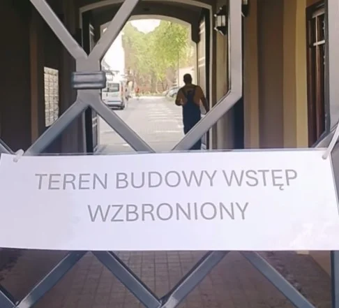 Na ujęciu widać kratę zamykającą przejście przez bramę w stronę podwórza. Co ciekawe, na kracie zawieszono kartkę z informacją "Teren budowy, wstęp surowo wzbroniony".