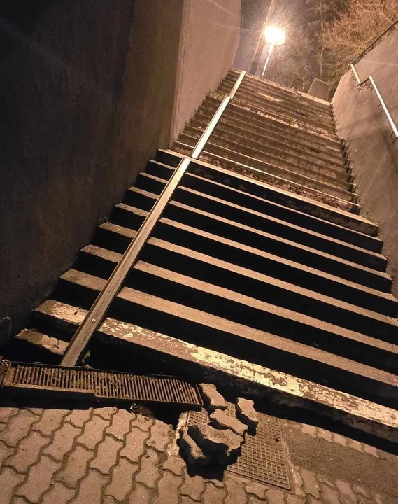 Poruszanie się osobom z wózkami w tym przejściu mają umożliwiać zamontowane na schodach szyny. Te jednak są regularnie niszczone. U dołu schodów pojawia się też kolejna przeszkoda - jest nią metalowa kratka zasłaniająca odpływ wody. Ktoś ją wyrwał, przy okazji wyjmując i rozrzucając dookoła kostkę brukową. Powstała dziura, o którą albo można się potknąć, albo w nią wpaść.