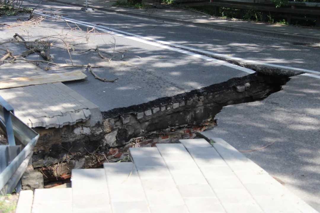 Wskutek obfitych opadów deszczu i gwałtownej burzy doszło do podmycia przyczółków mostu, zapadła się część jezdni oraz położonego obok chodnika. Od samego początku liczenia strat mieszkańcy obawiają się, że jego odbudowa może zająć nawet lata.