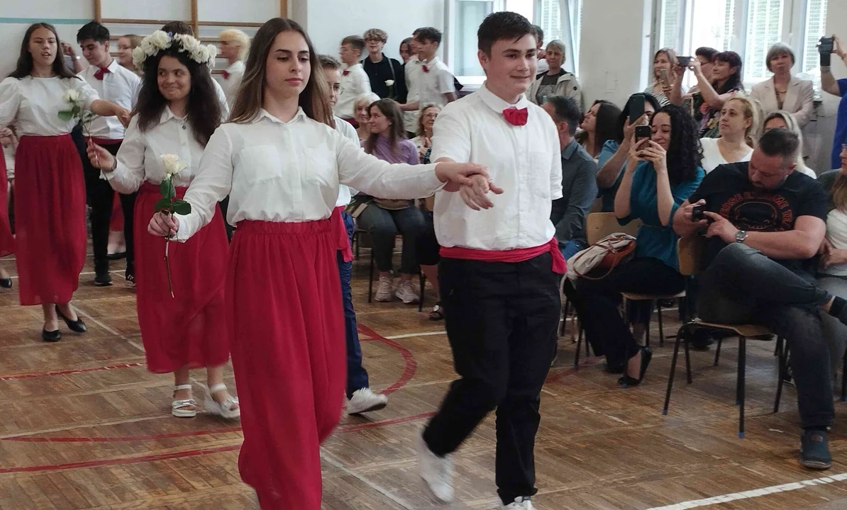 Na koniec ósmoklasiści odtańczyli poloneza. Wszyscy wyglądali bardzo elegancko: każda z dziewcząt miała białą bluzkę i czerwoną spódnicę, natomiast panowie zamiast pasków przy spodniach mieli czerwone szarfy. Taniec został nagrodzony gromkimi brawami.
