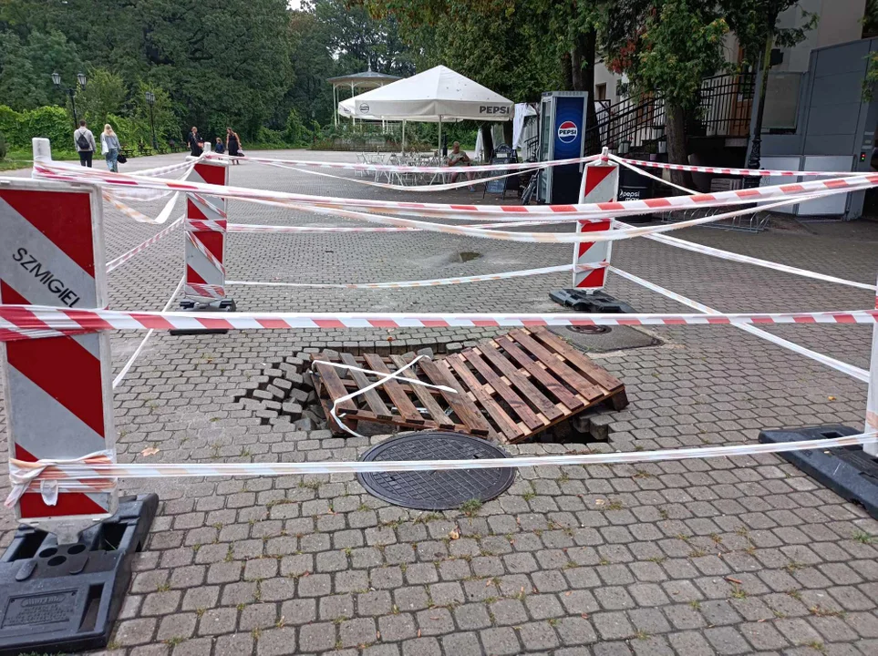 Udaliśmy się na miejsce. Krajobraz opisany przez radnego uzupełnia zapadnięta kostka brukowa w Parku Źródliska I, w pobliżu kawiarni. Miejsce zabezpieczono.