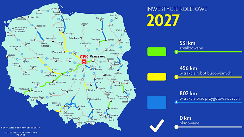 W skład CPK wejdą też inwestycje kolejowe: węzeł w bezpośredniej bliskości portu lotniczego i połączenia na terenie kraju, które umożliwią przejazd między Warszawą a największymi polskimi miastami w czasie nie dłuższym niż 2,5 godz. Inwestycja powinna umożliwić stworzenie ponad 150 tys. nowych miejsc pracy. W rejonie CPK powstanie Airport City, w skład którego wejdą m.in. obiekty targowo-kongresowe, konferencyjne i biurowe. CPK jest w 100 proc. własnością Skarbu Państwa, zaliczając się do spółek strategicznych z punktu widzenia interesów kraju.