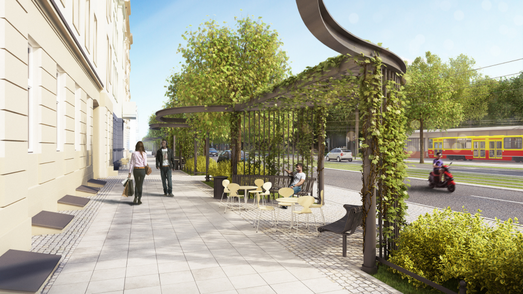 Dla pieszych na całym ciągu powstaną chodniki dopasowane do potrzeb osób niewidomych i niepełnosprawnych. Zamontowane zostanie nowe oświetlenie, ławki i kosze na śmieci. Wszystkie elementy małej architektury będą w stylu secesji.