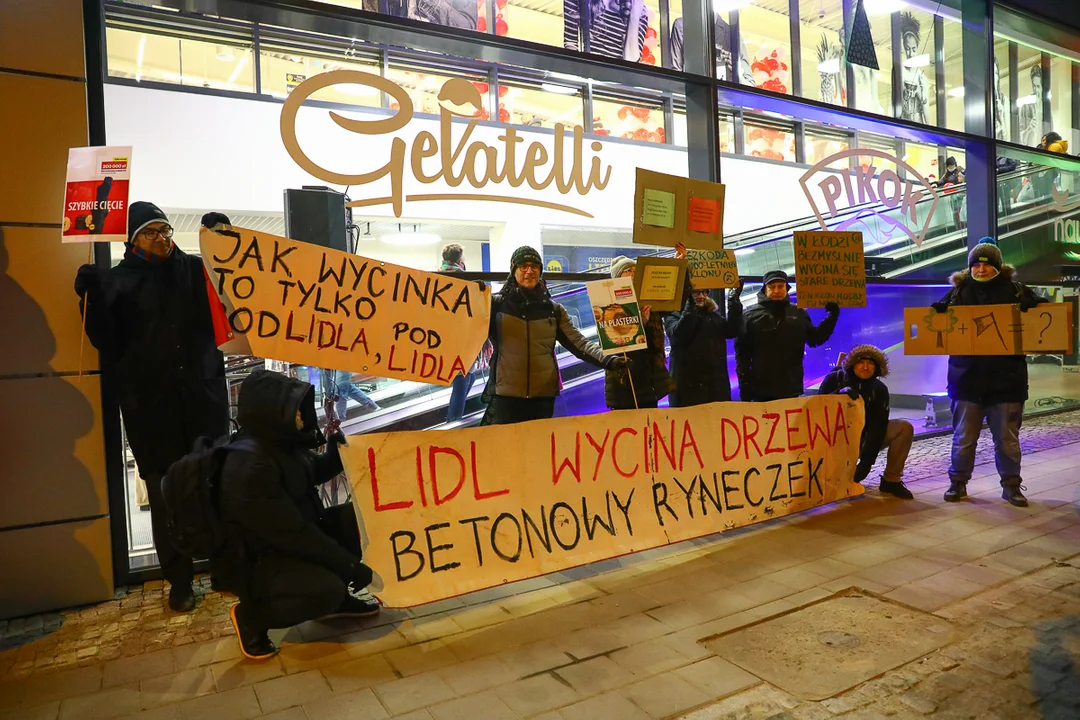 W czwartek 9 grudnia odbyło się uroczyste otwarcie supermarketu przy ul. Żeromskiego. Nie zabrakło na nim miłośników łódzkiej zieleni i obrońców drzew, którzy mimo mroźnej pogody stawili się wraz z transparentami i rekwizytami.