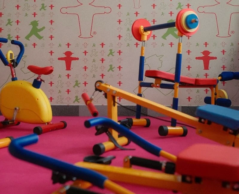 Urządzenia są dostosowane rozmiarem do użytkowników. Na miejscu znajdziemy w miniaturowej i kolorowej wersji: bieżnię, orbitrek, wioślarz, rowerek, a także ławeczkę ze sztangą.