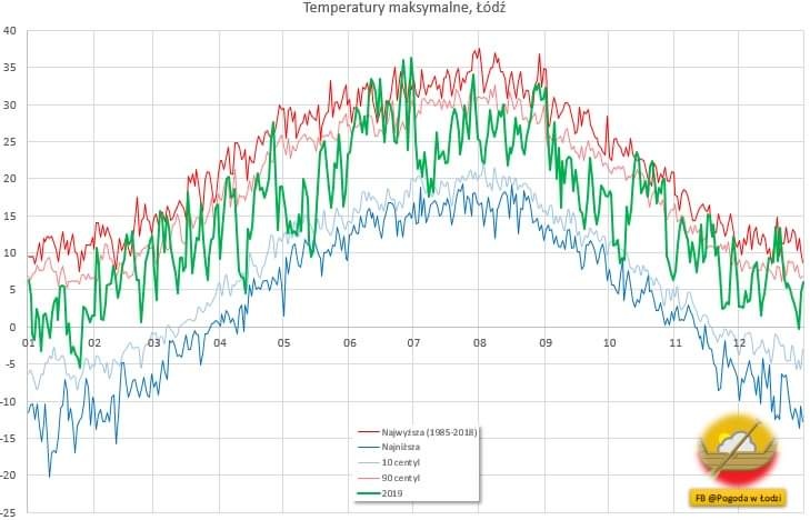 Najwyższe absolutne temperatury maksymalne odnotowano w tym roku dość nietypowo, bo już w czerwcu: 30.06: +36,3C oraz 26.06: +36,0C. Były to jednocześnie łódzkie rekordy czerwcowych temperatur, dotychczasowy - +35,4C – pobity został od razu dwukrotnie.
