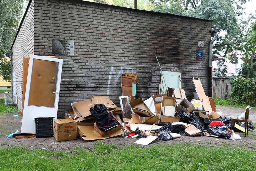 Niechciane odpady gromadzą się obok hydroforni przy ul. Grodzieńskiej 28A w Łodzi na terenie Spółdzielni Mieszkaniowej Osiedle Młodych na łódzkim Karolewie. W tym samym budynku znajduje się jeszcze jeden garaż własnościowy. Prawo do wystawiania odpadów w tym miejscu mają wyłącznie mieszkańcy dwóch pobliskich bloków.