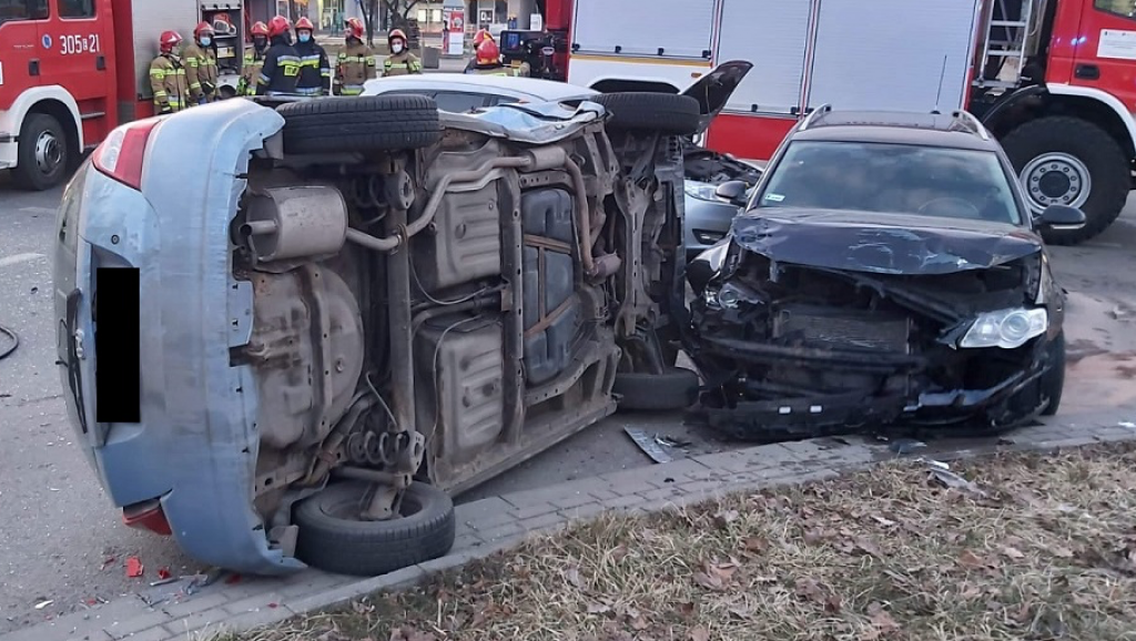 Siła zderzenia pojazdów była tak duża, że Honda przewróciła się na bok, a Volkswagen uderzył w jadącego prawym pasem ruchu Forda kierowanego przez 67-latka.
