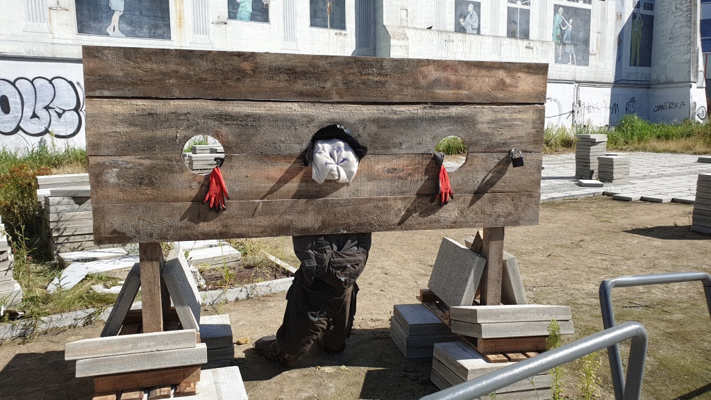 Biznesmen stracił cierpliwość i na swojej działce, zamiast imponującego budynku, postawił drewniane wychodki oraz dyby.