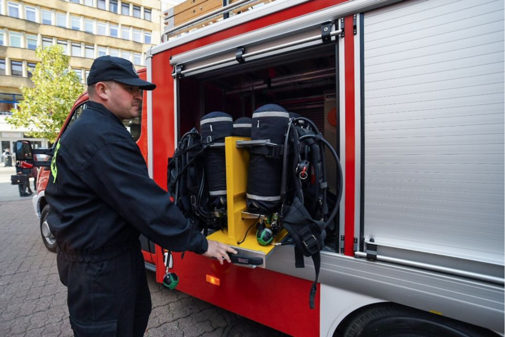 Strażacy udzielający pomocy medycznej są wyposażeni w maseczki i rękawiczki, a także stroje zapewniające ochronę przeciwchemiczną, które są przeznaczone do kontaktu z pacjentem zakaźnym.