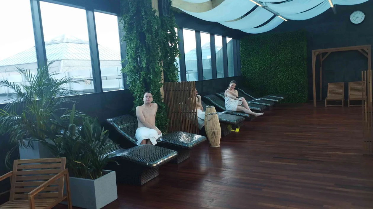 Na parterze znajdują się leżaki i podgrzewane ławy w otoczeniu bąbelkowych ścian. Na antresoli znajdziemy wiele naturalnych elementów, m.in. podłogę wykonaną z afrykańskiego drewna i żywą zieleń. Goście mogą odpoczywać na 20 leżakach oraz kilku zestawach wypoczynkowych. Antresola jest przeszklona, dzięki czemu podczas relaksu można podziwiać znajdujący się obok park. W szatni stanęło 200 dodatkowych szafek na odzież.