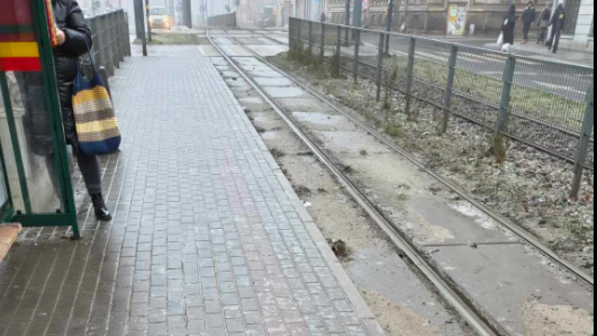 Duże oblodzenie jest na przystanku przy skrzyżowaniu Więckowskiego i Zachodniej. Pasażerowie wysiadający z tramwaju trafiają prosto na lód – wielu z nich traci równowagę i przewraca się tuż po opuszczeniu pojazdu.
