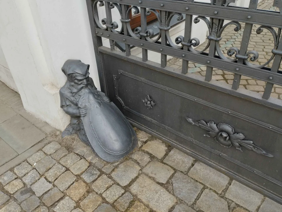 A właśnie odbojniki-krasnale, jedne z najlepiej zachowanych, znajdziemy w bramie wjazdowej do Białej Fabryki Geyera przy ul. Piotrkowskiej 282. Dziś mieści się w niej Centralne Muzeum Włókiennictwa. Odbojniki mają groźne miny i zasłaniają brzuchy tarczami.