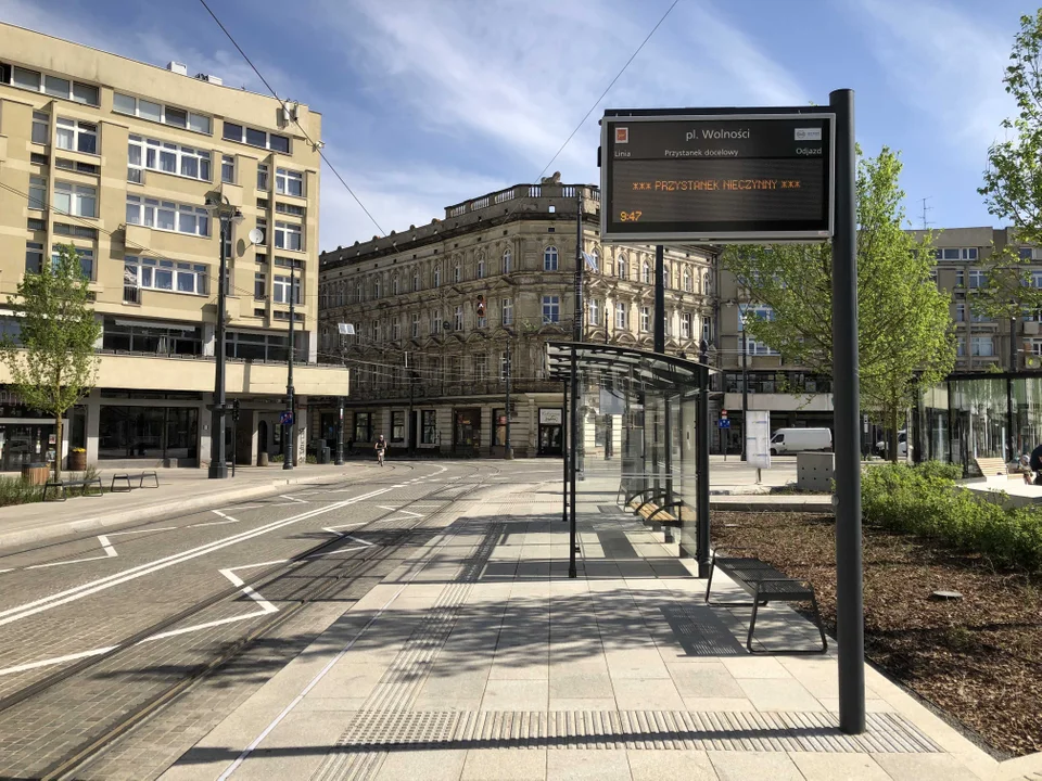 Kolejny przystanek przy placu Wolności z tramwajami MPK Łódź