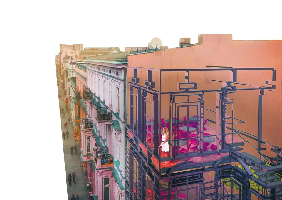 Jego inspiracją była praca sprzed kilkunastu lat, którą stworzył wspólnie z Wojciechem Saloni-Marczewskim. Zaproponowana wtedy przez architektów idea „drucianej kamienicy” w pasażu Rubinsteina zakładała rekonstrukcję budynku, który stał tam do lat 60. XX w. Wtedy nie udało się zrealizować projektu, ale po rozbiórce ogródka pojawiła się taka możliwość.Konstrukcja stworzy przestrzeń dla lokalu z wielopoziomoweym ogródkiem, z którego będzie rozpościerać się widok na ul. Piotrkowską i pasaż Schillera.