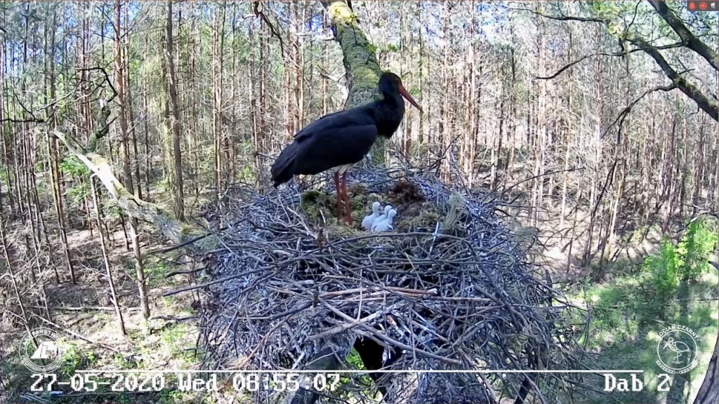 Przed naszą parą trudny, życiowy sprawdzian – teraz pisklaki są zdane na ich opiekę, na ich czujność i siłę. Nie powinny zostawać same choćby na chwilę, w lesie czeka zbyt wiele niebezpieczeństw. Zagrożenia jakie czyhają na pisklęta bocianów to zimno, choroby, niedostatek pokarmu. A z zewnątrz to jastrząb, kuna i bielik. Wierzymy jednak, że para jest zgrana i upilnuje lęgu. Rodzice muszą być w pełni zaangażowani – karmić młode kilkanaście razy dziennie, później kilka, chronić, ogrzewać i czyścić im dziobem upierzenie.