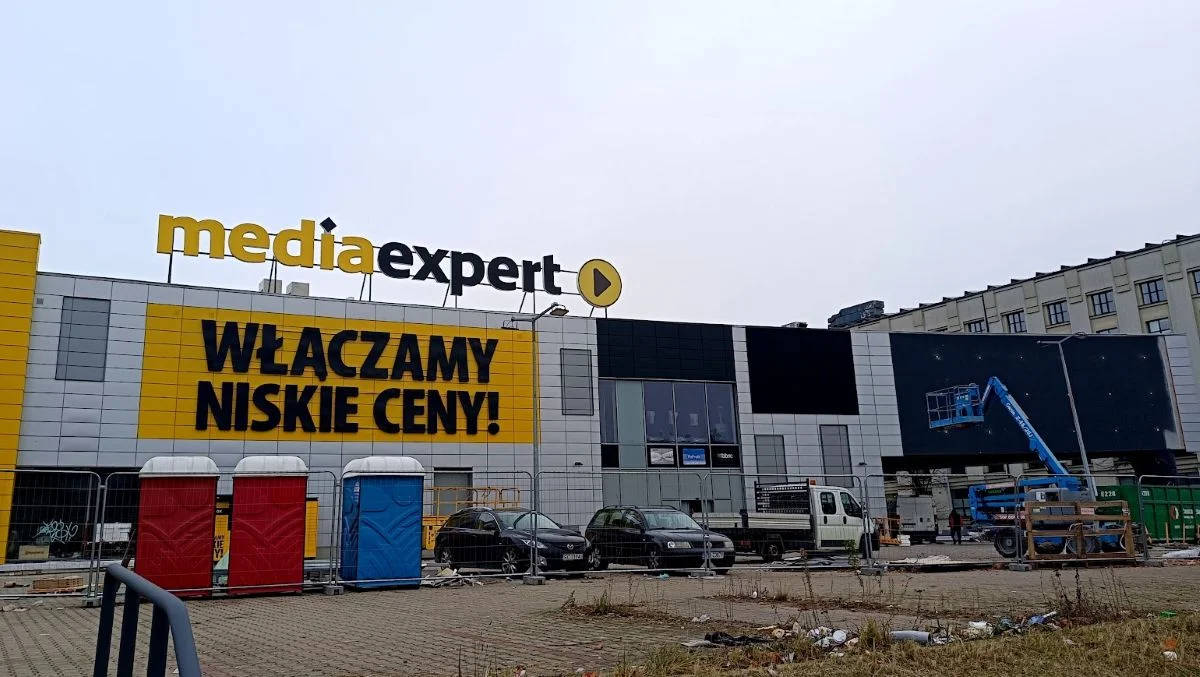 Jeszcze stoją toitije, ale placu budowy widać, że ekipy pracują jak w ukropie, żeby zdążyć przed otwarciem. Na elewacji już pojawił się charakterystyczny slogan Media Expert: „Włączamy niskie ceny”, a obok stoi nowa wiata na wózki z dużym napisem: „Zapraszamy do nowego Auchan”.