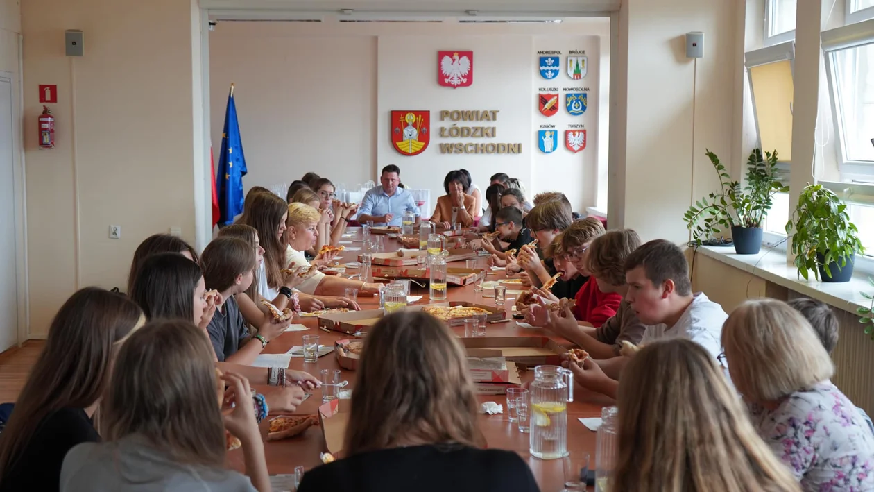 Po zwiedzeniu urzędu młodzi ludzie usiedli ze starostą przy długim stole. Zamiast tradycyjnych ciasteczek i paluszków, pojawiła się na nim... pizza. Było osiem dużych opakowań, w różnych smakach. Wspólne jedzenie było okazją do rozmowy.