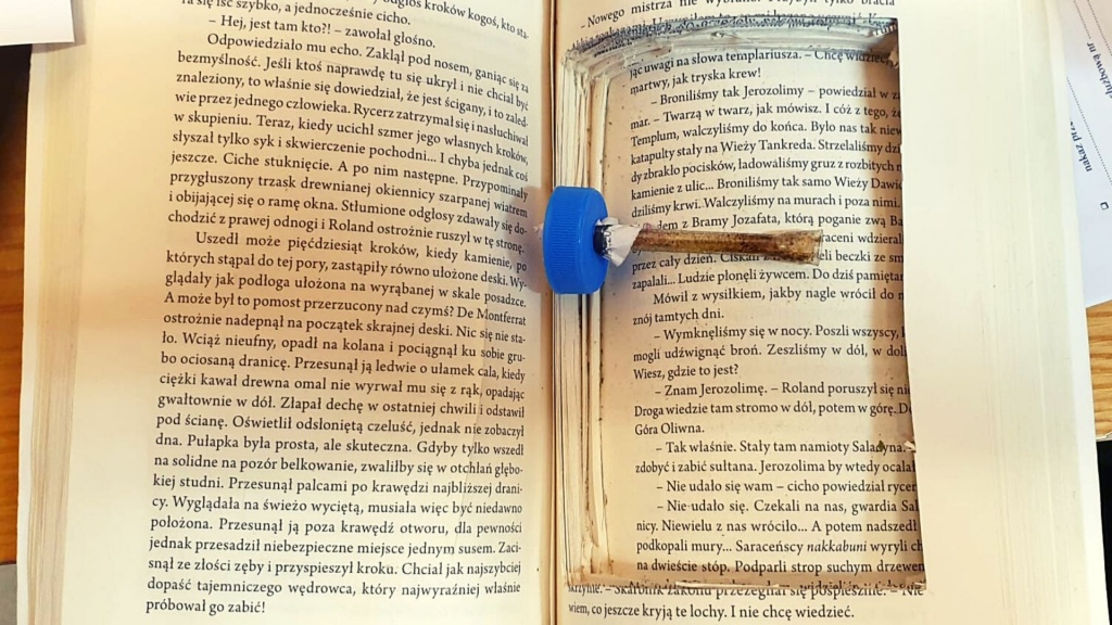 Oprócz posiadania narkotyków, u mężczyzny w domu znaleziono także pomysłowy przedmiot służący do ich ukrywania. W jednej z książek stojących na półce wycięto częściowo strony uzyskując w ten sposób swoistą szkatułkę do przechowywania narkotyków.