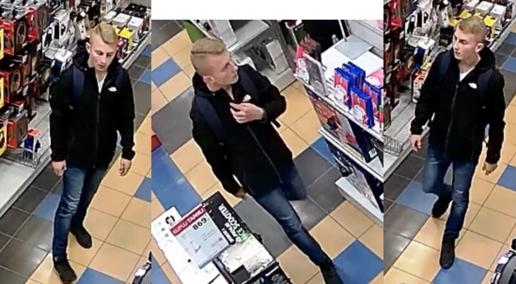 Rysopis poszukiwanego: mężczyzna w wieku 20-25 lat, sczupłej budowy ciała o włosach jasnych blond czesanych na bok z przedzialkiem, ubrany w bluze/kurtkę koloru czarnego,spodnie jeansowe niebieskie, czarne buty , podkoszulek biały z krótkim rękawem i trzykolorowy plecak bialo-czerwono-granatowy.