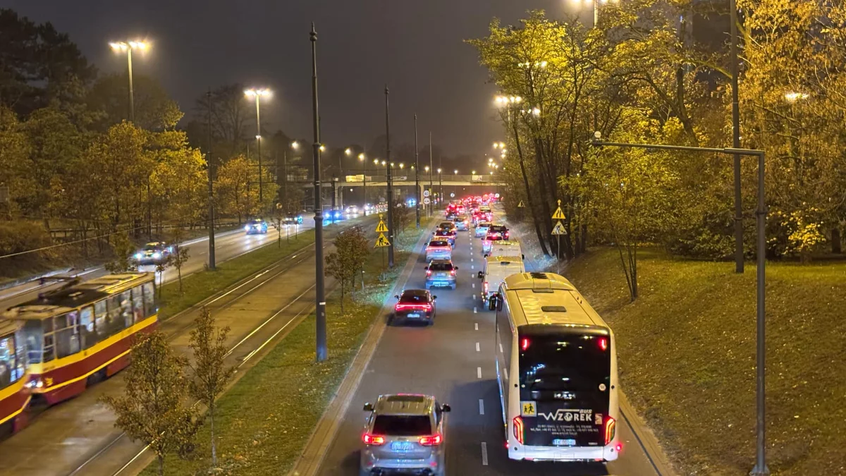 Trwają godziny szczytu w Łodzi. Coraz bardziej zakorkowana staje się aleja Adama Mickiewicza — zwłaszcza na wysokości remontowanej naprzeciwko hotelu DoubleTree kładki dla pieszych, gdzie zwęża się ulica i na niewielkim odcinku z użytkowania wyłączony jest lewy pas.