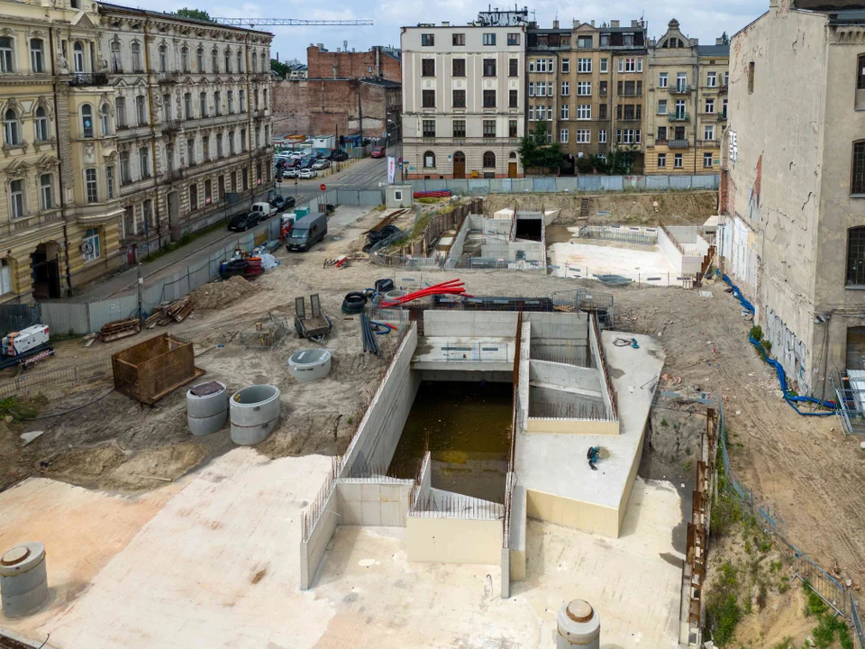 Wielki plac budowy w centrum Łodzi - tutaj powstaje podziemna stacja "Łódź Śródmieście"