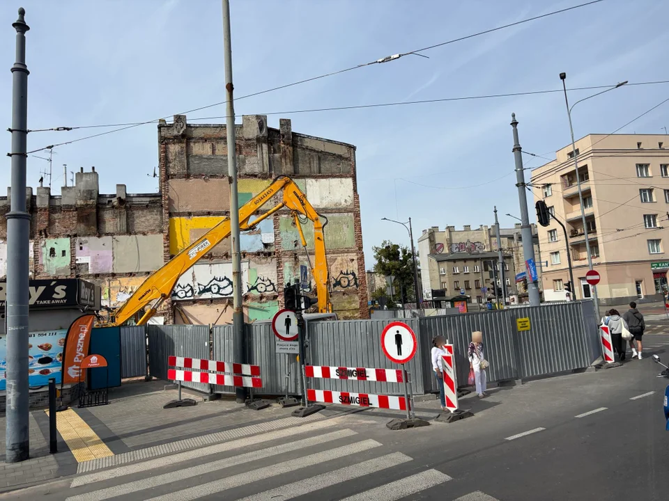 Nieco inaczej wygląda sytuacja dla pieszych. Wciąż wyłączony z użytku jest fragment chodnika tuż przy wyburzonej kamienicy. Przy przejściu dla pieszych od strony Zachodniej widnieją dwa znaki mówiące o zakazie ruchu pieszych. Podobne znaki znajdziemy wysiadając z tramwaju linii 2 i 5, gdzie dostępne jest przejście wyłącznie w kierunku Zgierskiej.