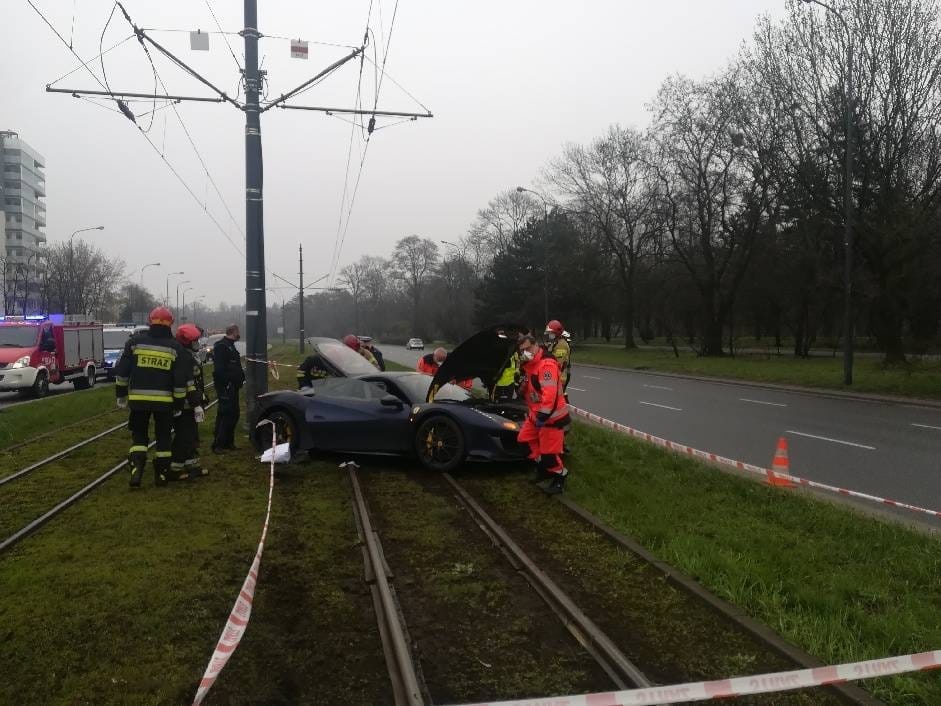 Wartościowy supersamochód rozbił się na torowisku na al. Mickiewicza w Łodzi. Do wypadku doszło w sobotę, 17 kwietnia.