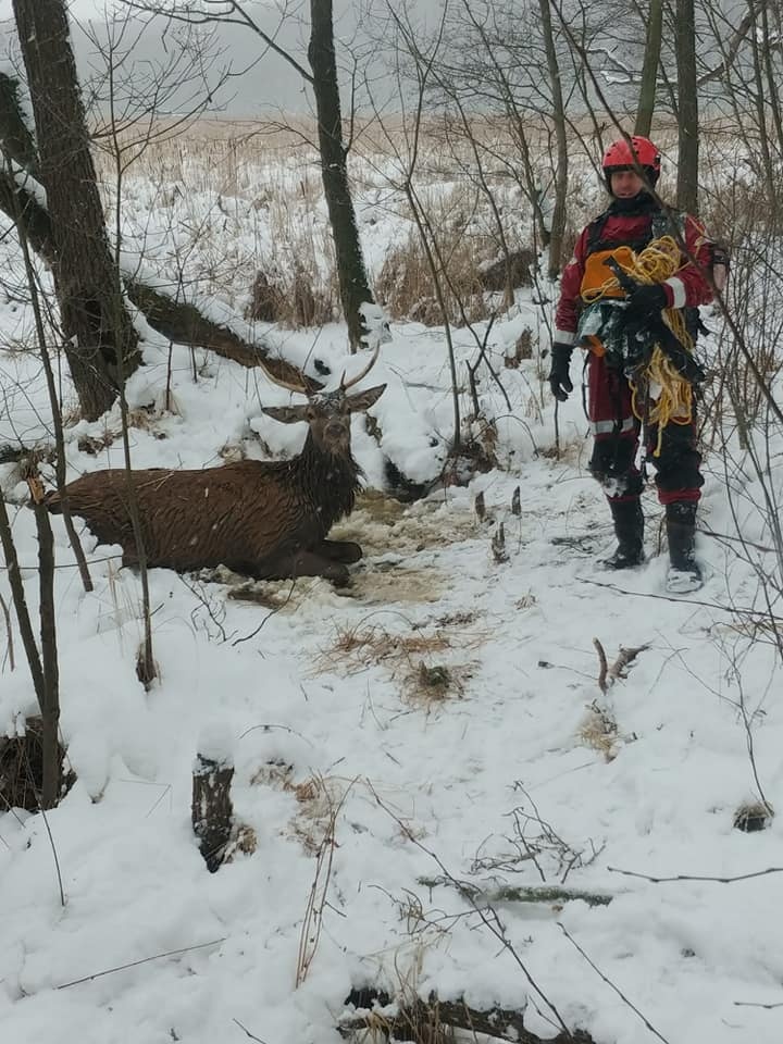 W sobotę, 16 stycznia Strażacy z Jednostki Ratowniczo-Gaśniczej w Strykowie przy wsparciu Ochotniczej Straży Pożarnej Koźle przeprowadzili akcję ratunkową wyciągnięcia z wody jelenia, pod którym załamał się lód na jeziorze.