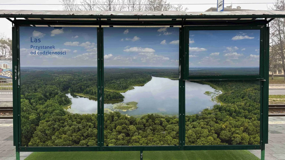 Leśne przystanki z dywanem ze sztucznej trawy oraz okleiną widok na las można spotkać w kilku miejscach na terenie Łodzi.