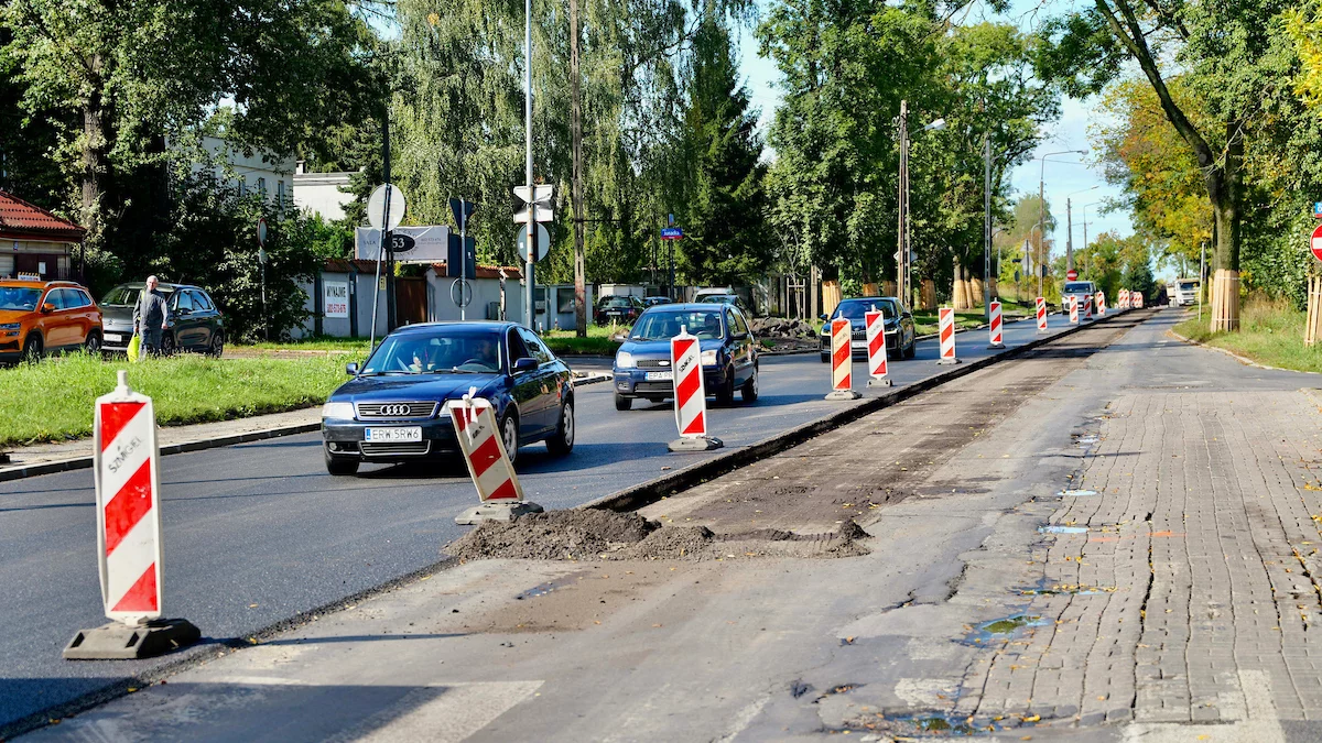 Na części modernizowanej ulicy Brzezińskiej drogowcy przenieśli ruch samochodowy na nowy pas jezdni. Teraz bliźniaczy zakres robót wykonają po drugiej stronie drogi. Dla kierowców to zmiana na plus, bo jeździć mogą już po równej nawierzchni. Poza tym nic więcej jednak się nie zmienia.