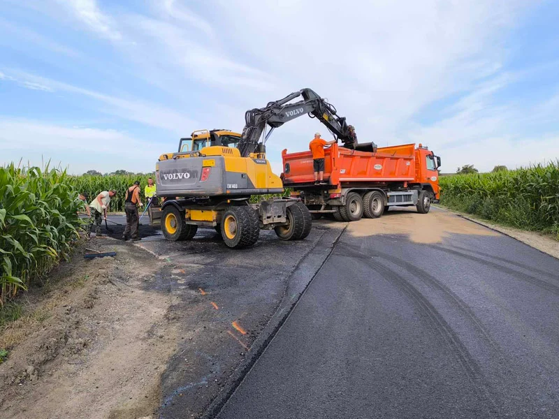 Na sporym odcinku udało się już wylać nowy asfalt, ciężki sprzęt pracuje także przy wjazdach na posesje i skrzyżowaniach.