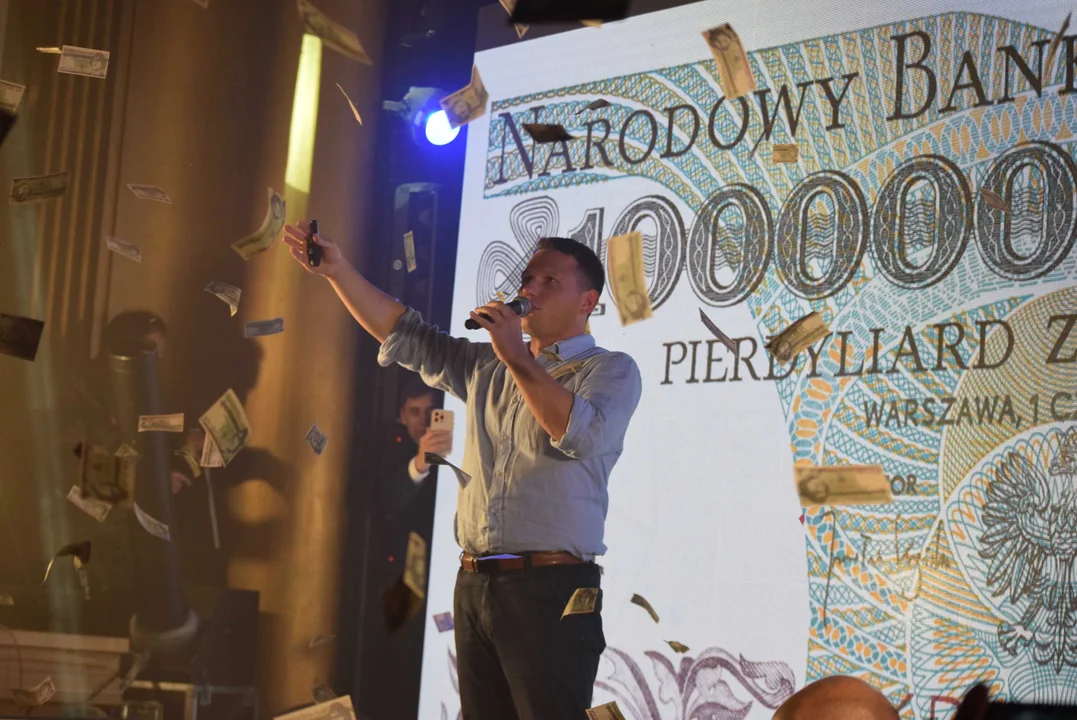 Sławomir Mentzen z kolei zaczął od wyrzucenia w publiczność banknotów. Te nie były jednak prawdziwe. Pokazał też memy, które stworzono na jego temat oraz na temat przedstawicieli innych ugrupowań.